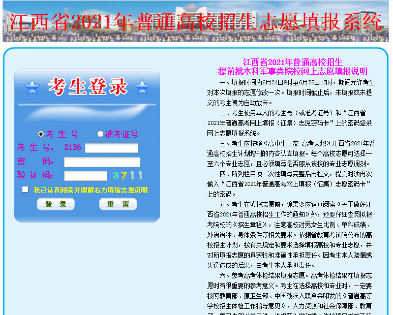 考生登陆江西教育考试网(http://www.jxeea.cn/),点击“2021年普通高考志愿填报”,输入本人考生号和密码,进入志愿填报网站。